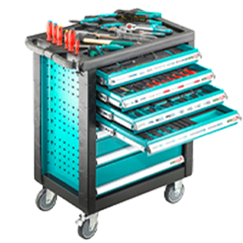 Hochwertiger Werkstattwagen im trendigen „Racing“-Design. Bestückt mit 297 ausgewählten Werkzeugen, bietet der Wagen ein unverzichtbares Sortiment für jeden Profi.6 Schaumstoffeinlagen, bieten jedem Werkzeug seinen Platz und sicheren Halt. Daneben sind zwei Schublade leer und bieten viel Platz für eigene Werkzeuge oder Kleinteilfächer.