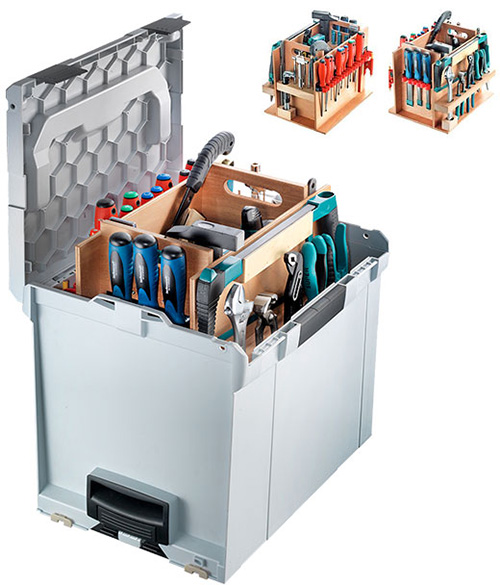 81-teiliger Satz, mit 300 mm Metallsägebogen. Jedes einzelne Werkzeug ist sauber, im speziell für die L-Boxx hergestellten und herausnehmbaren Holz-Einsatz, verstaut. Nicht nur die Werkzeugauswahl passt perfekt zum mobilen Arbeiten, auch die L-BOXX ist auf diese Anforderungen ausgelegt. Sie passt ohne Adapter in jedes Fahrzeugeinrichtungs-System von Sortimo, lässt sich mit bis zu 25 kg beladen und der Deckel hält sogar Belastungen von bis zu 100 kg aus. Selbstverständlich lässt sich die Box ebenfalls mit nur einem Klick in das umfangreiche System "L-Boxx" integrieren.